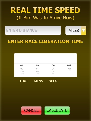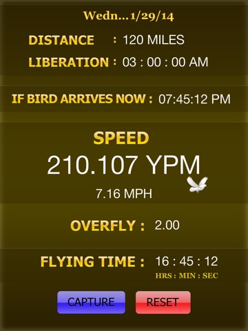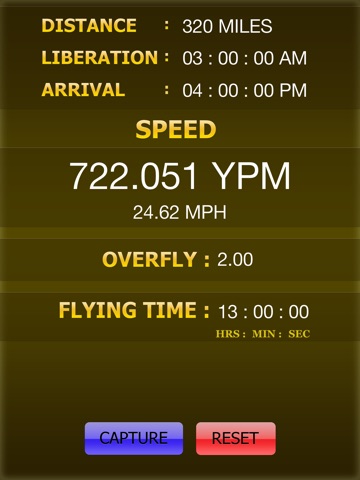 * REALTIME CALCULATOR is a live, ticking countdown speed display to keep running while awaiting a birds arrival home. It will tick away live, in real time showing you the birds current speed, flight time, and overfly if it were to arrive at that moment. You can watch the speed decrease and overfly increase on the display as time is passing. At the moment a bird arrives, there is a CAPTURE button to either save your screen as a photo image to your ipod, ipad, or iphone, or to send a screenshot as an email.