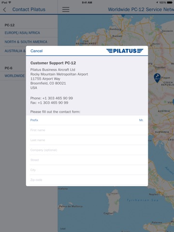 The map overview shows the worldwide PC-24 and PC-12 Service Network and provides information and contact details about every Service Center including instant communication access via phone or email. All AOG numbers can be called directly.