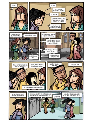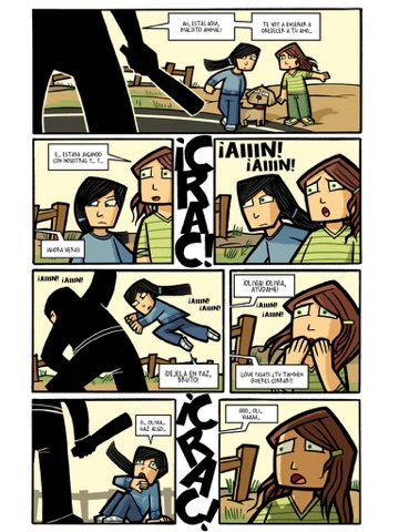 "Podría parecer mentira, o una historieta en lugar de una historia, o algo lejano o irreal, como si la realidad no tuviera nada que ver con los dibujos que aparecen en el cómic, ni los personajes con las personas que caminan a nuestro lado, que cogen el metro o el autobús al mismo tiempo que lo hacemos nosotros o nosotras. Pero os aseguro que la historia de Olivia y Martín es verdad y que sus personajes no vienen de otro mundo ni son producto de la imaginación. Los protagonistas pueden ser cualquiera de los chicos y de las chicas con los que os encontráis habitualmente en el patio o en las aulas, en la calle o en un centro comercial. Gente conocida, chicas que se quedan pilladas por chicos que al principio son muy simpáticos, pero que después se creen dueños de ellas, que consideran que son suyas, algo que les pertenece... y dejan de ser simpáticos para volverse violentos..."