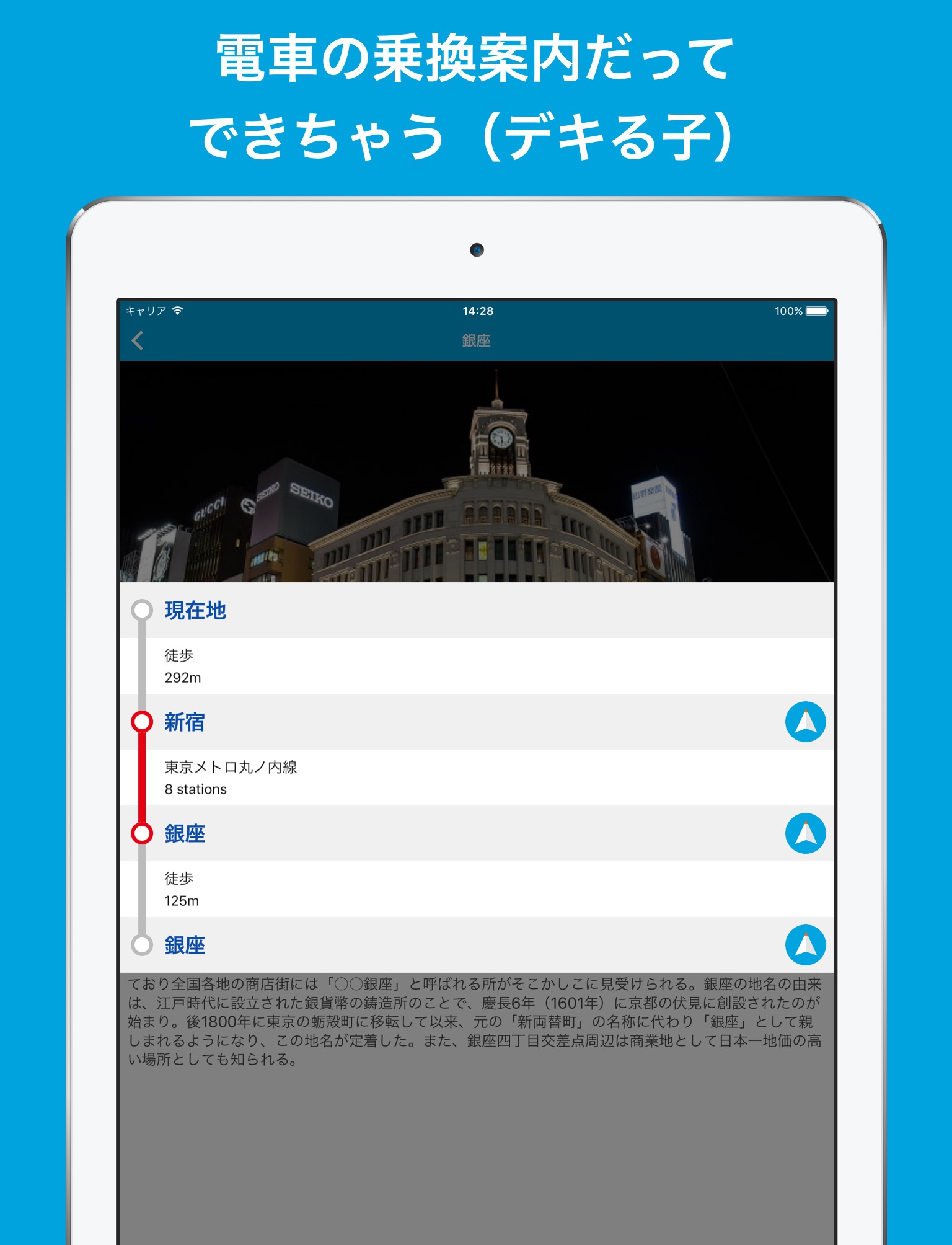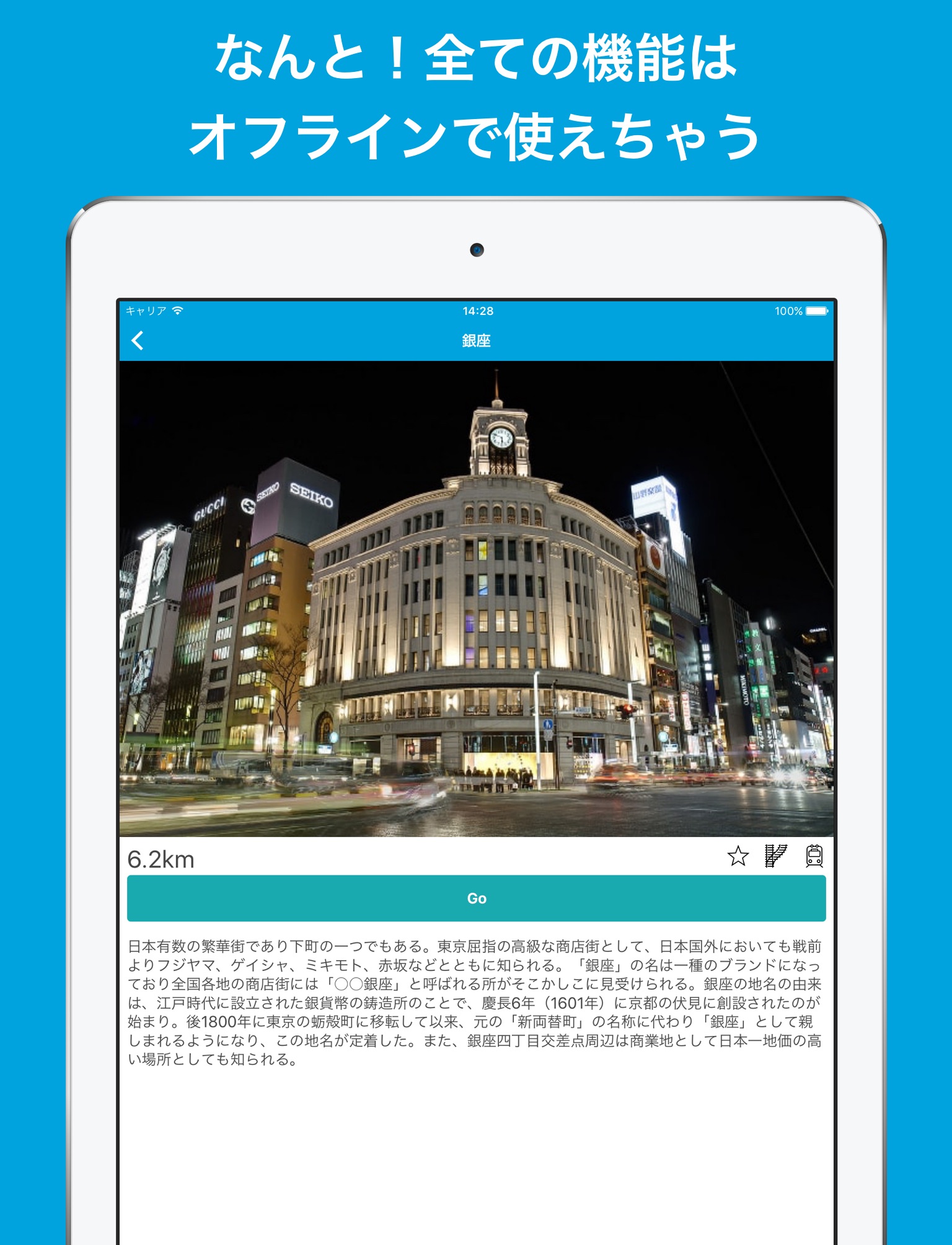Pilot contains the location information of all stations. For that reason, you can search for transfer information to your destination from wherever you are. The subway systems of London and Tokyo are complicated, so tourists often get lost. If you have Pilot, you won’t. And of course this feature requires no internet connection, so you can use it offline.