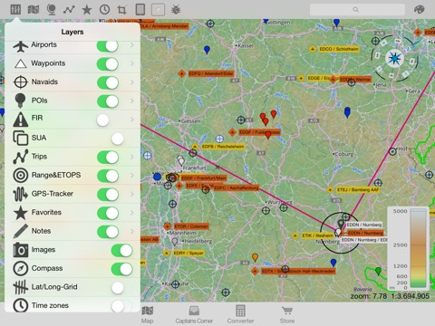 Detailed mapping with selectable aeronautical overlays.