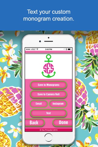 Our incredible preppy App allows you to create your own customized monograms to personalize your texts, emails, Instagram and Facebook posts. You can also use them for wallpapers and backgrounds! Our App creates an Emoji type icon that you can text to your friends with our "TEXT Button." It takes you directly into your message with your adorable preppy monogram in place to personalize your text messages. Your monograms can be in the shape of whales, anchors, and even bows. Start with your three letter monogram, then choose your font, add color patterns, shapes, and Preppy inspired backgrounds! Once your monogram is perfect, save it. The app creates a "My Monograms" folder in your photo library, and you can also save them within the app! Then you can quickly and easily find and choose the perfect monogram to customize your perfect text, post, email, background and wallpaper. The options are endless.