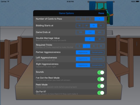 Great game until last update. Now scoring doesnt work correctly and achievements cant be reset. Too bad. I loved it. Nothing worse than getting a double marriage and having it only give you 9 points and then going set!