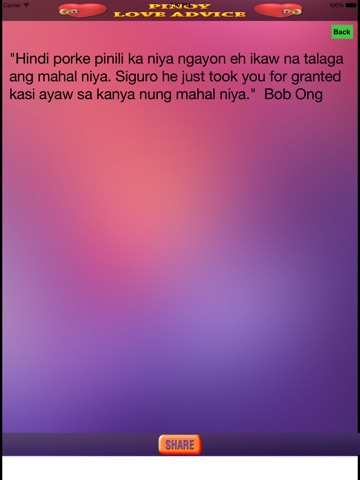 Pinoy Love Advice contains many advice and quotes from our famous love gurus like Papa Jack, Bob Ong and many more which you can share through Facebook or Twitter.
