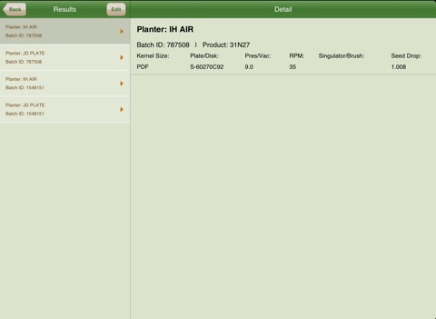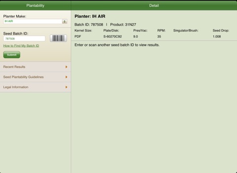 · For devices without the scanner capability (early iPad models), you can enter the seed batch information via the keypad, along with the planter make, to view customized planter settings.