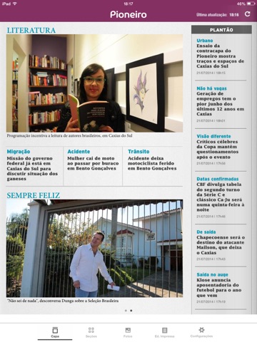 Fique informado sobre Caxias do Sul e região, dupla Ca-Ju e os principais times de futebol da Serra. Veja notícias sobre cultura e tendências e também sobre os fatos policiais das cidades de cobertura do Pioneiro. Você ainda poderá acessar a previsão do tempo e conferir as galerias de fotos.