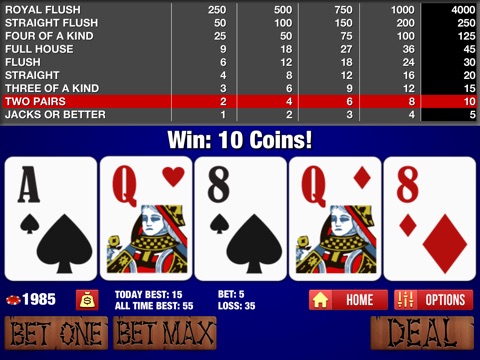 The game plays well for the most part. However, it hit me twice now. In double bonus poker when you get 4 aces and a 2,3 or 4 card it states you get 2000 credits but it only pays the 800 you get for 4 aces. Dissapointed for all the hours played. But , what ever... And I think two pair should pay a little more than what a single pair of jacks or better pay.. All in all fun way to kill time..