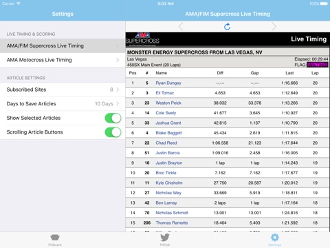 This is the ultimate App for the Motocross and Supercross Fan! Get updates from some of the most popular MX and SX websites and publications. Save an article to read later by adding it with a press to the Next Lap reading list! Not enough news? Twitter integration allows you to see up to the second news from popular riders, teams, publications and more! Not near your TV or at the race on race day? Live timing and scoring for the AMA National Motocross Series and the FIM Supercross series lets you watch the races from PitBoard! Download now and get your Motocross and Supercross fix!