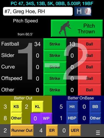 Pitch Counter Pro lets you track your pitchers performance with detailed stats, built-in speed estimator, and customizable rest warning alerts. Get real-time stats on your pitchers including Pitch Count, Strikes, Balls, Batters Faced, Strikeouts Swinging, Strikeouts Looking, Base on Balls, Hit By Pitch, First Pitch Strike, Innings Pitched, Earned Run Average, and more! Optionally estimate the speed of every pitch thrown and decide when your pitcher is losing his stuff. Includes built-in rest warnings that let you know when your pitcher has reached pitch count rest limits for your pitchers age group. Easily provide pitch count information to umpires and team managers during the game.