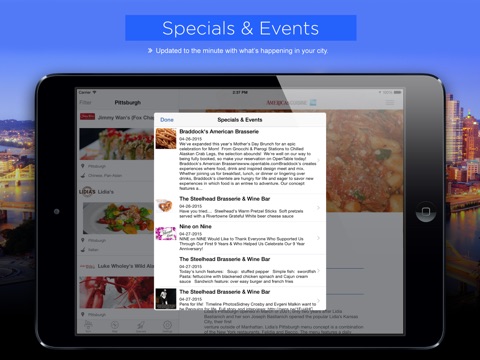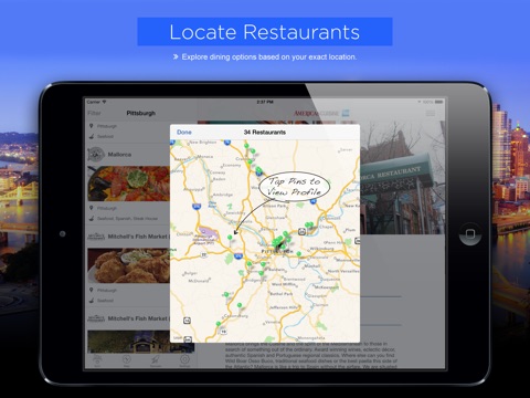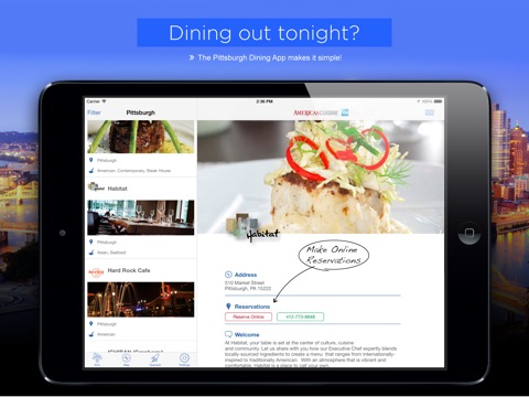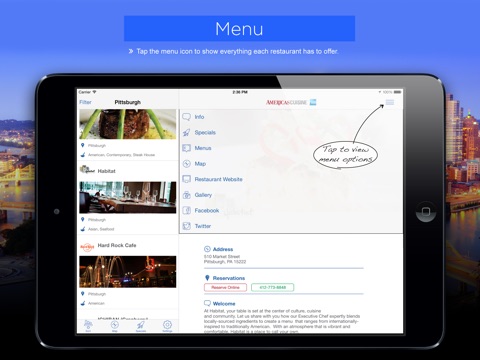 Every restaurant listing includes menus, photos, restaurant amenities, reservation capabilities and GPS directions to help mobile diners find the best meal in the city. Using advanced search options, pick your restaurant by name, location, cuisine type or meals served with the search option. The Pittsburgh Dining App is supported by AmericasCuisine.com, a Nationwide Dining Guide that diners and travelers have learned to trust over the past 20 years.