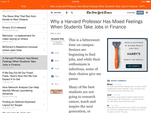 Pivit takes a different approach to HN, showing comments first. I built it the way I read HN, as the value to me is in the community. And I often check the comments briefly first to see if an article is actually worth reading, because it filters out the inflammatory or link bait posts. My time is valuable.