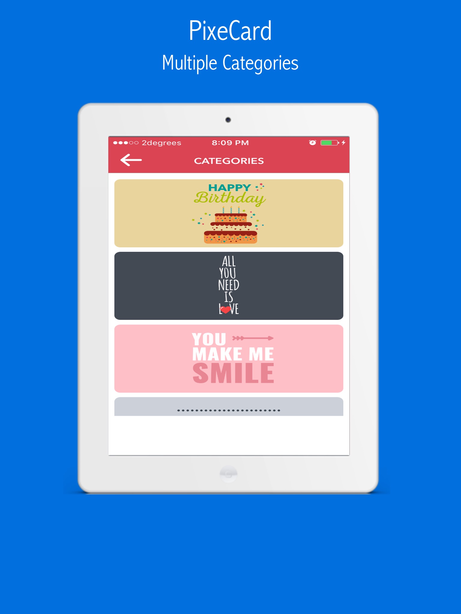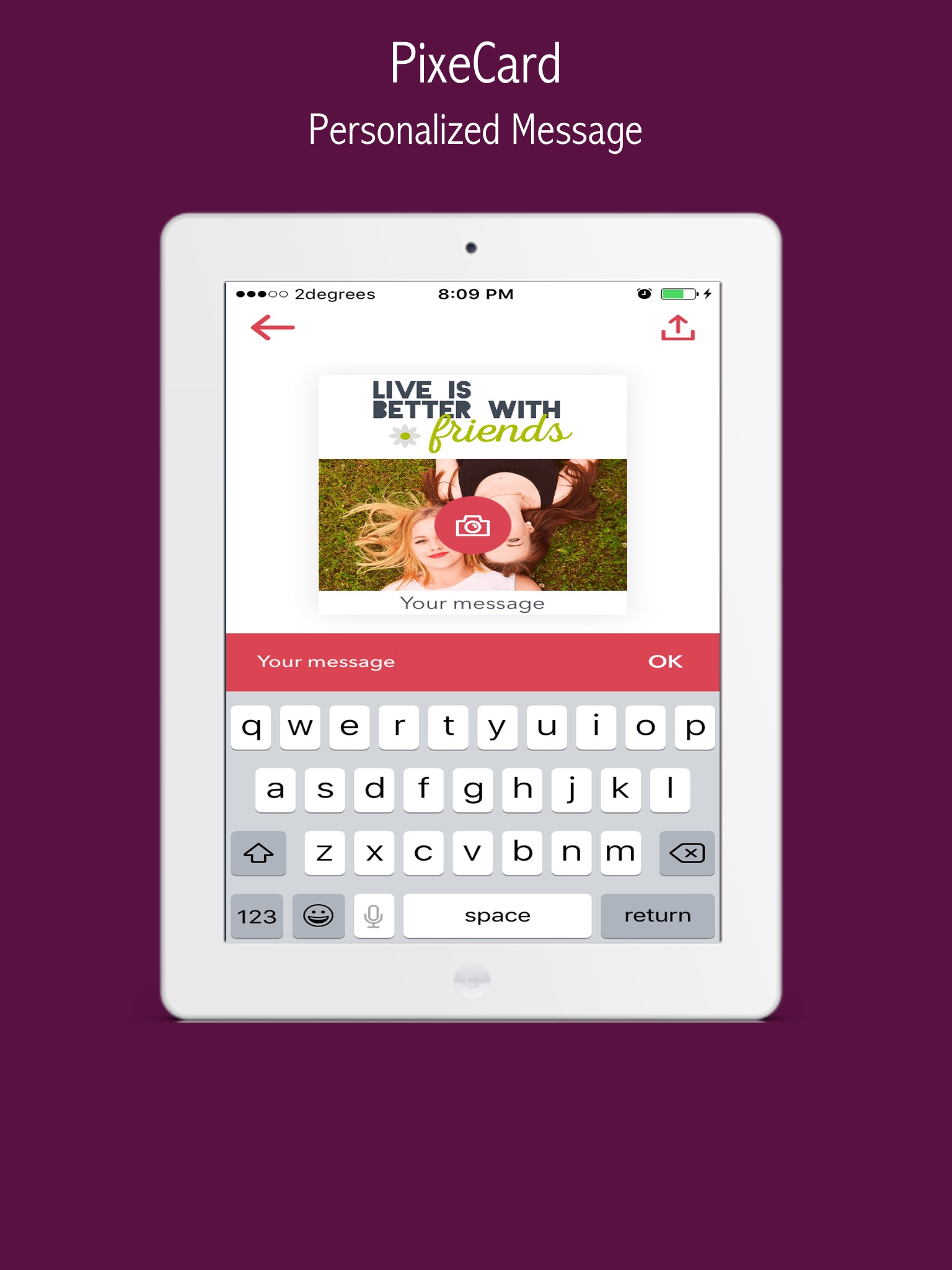 PixeCard lets you personalize and send awesome greeting cards from your phone to your friends, family, and beyond, via TXT Messages, Email, Twitter or Facebook.