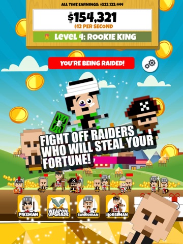 Tap on enemy soldiers to fight them, earn money, and then buy upgrades to level up and become the most successful knight army leader of all time! Be careful though, raiders will try to steal from your idle empire with random attacks, but with all of your upgrades and bonuses – you’ll defeat them easily.