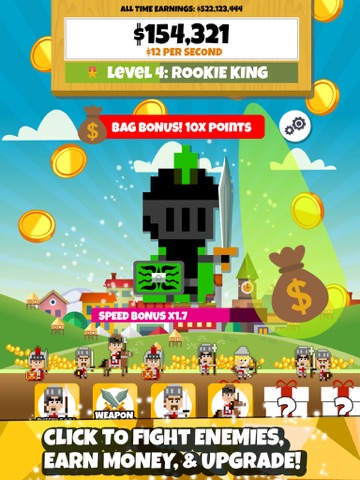 The most addictive knight army building, idle clicking, and FREE pixel war game is here! Click your way past 23 levels to build a massive fortune and a huge army of medieval soldiers. See the empire you build grow before your eyes as knights, archers, and even dragons fill up your base!
