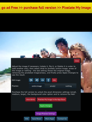 - then, open Image/Pixelate Settings, make sure that Pixelate - Entire Image is selected, then press Apply Changes and the image will be pixelated