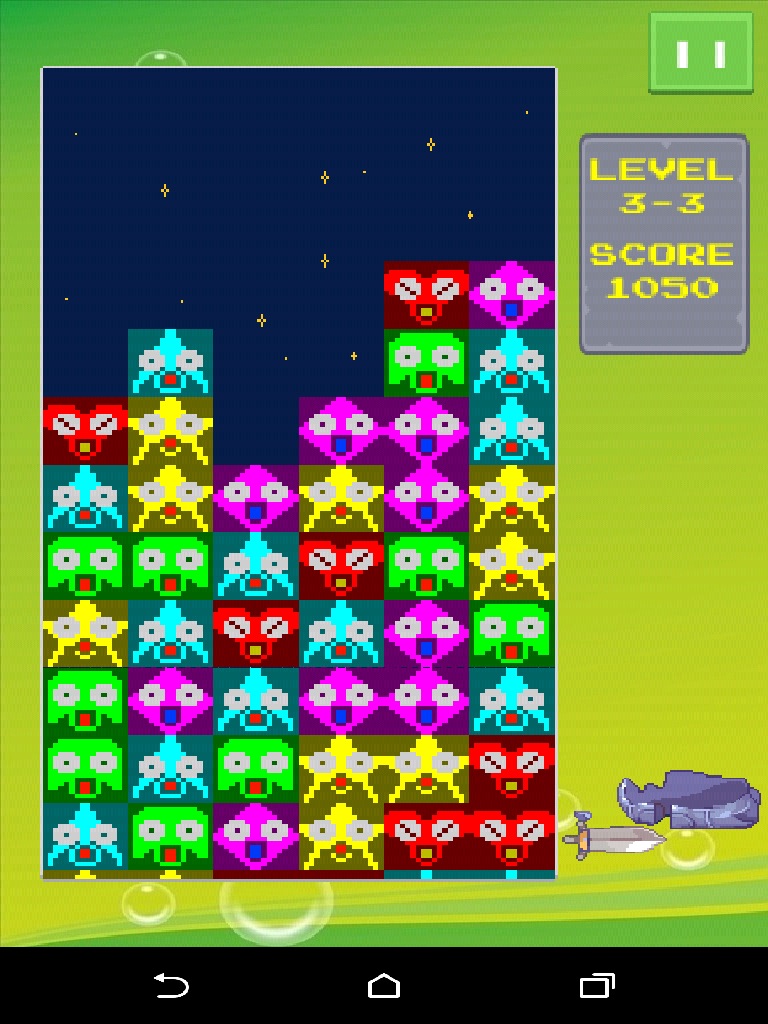 In Pixel Attack(Block Attack), the player is presented with a playfield consisting of a virtual grid of squares, each of which can be occupied by a colored block. Blocks are stacked on top of one another and rise steadily toward the top of the playfield, with new blocks being added at the bottom. The player must arrange blocks in horizontal or vertical lines of three or more matching colors by swapping blocks horizontally two at a time. As matching lines are formed, the blocks are cleared from the screen and any blocks above them fall into the gaps. The game is over when the blocks touch the top of the playfield, or another game-ending condition is met (such as reaching a time limit or clearing blocks below a set line).