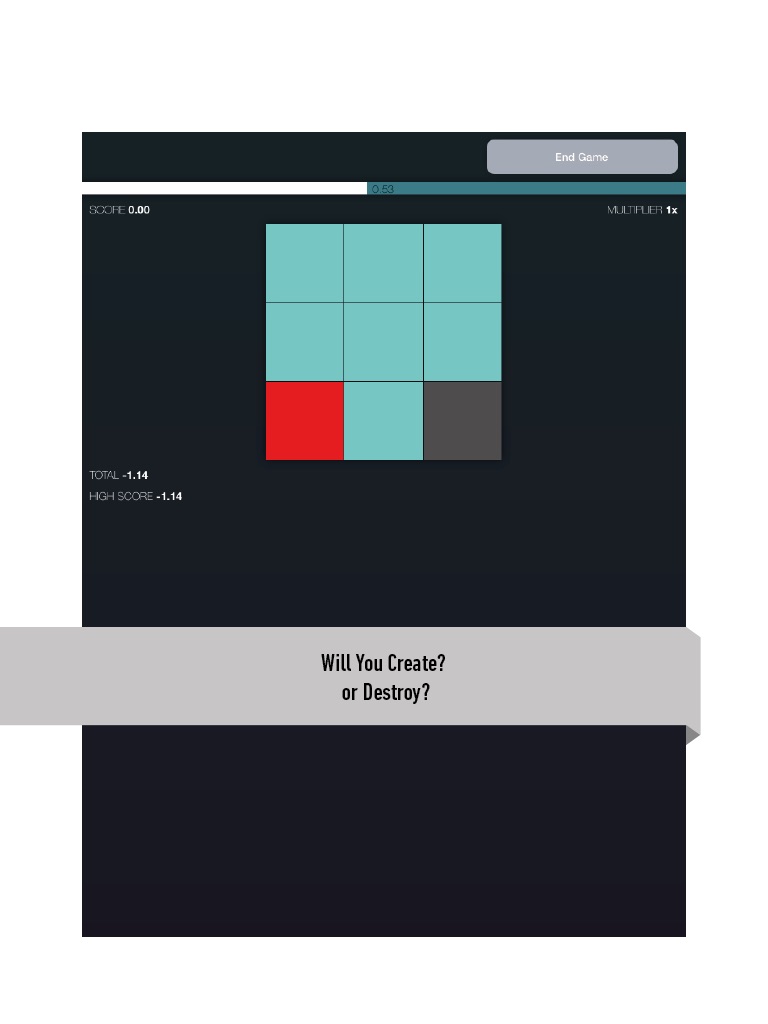 In Pixels you can create a Pixel by tapping an empty space or Destroy one by tapping a filled space. By continuing to create or destroy you will get more points. If you make a mistake and press the wrong pixel your score will be lost so make sure to click save to bank your points!
