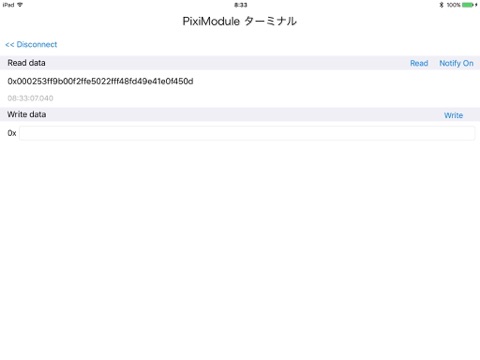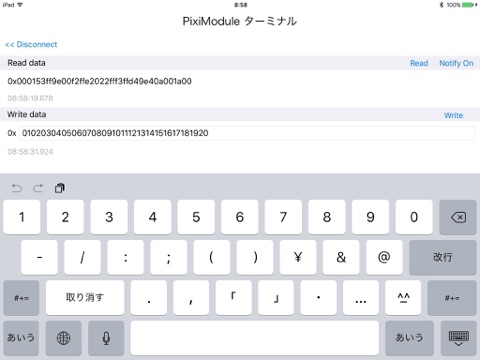 PixiModuleターミナルは、株式会社ヌマタR&DのBluetooth LEモジュール「PixiModuleシリーズ」と簡単に通信データの送受をご確認いただけるターミナルアプリです。