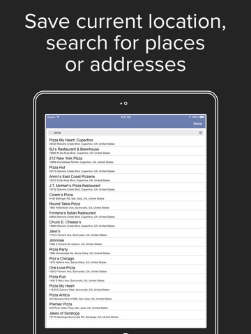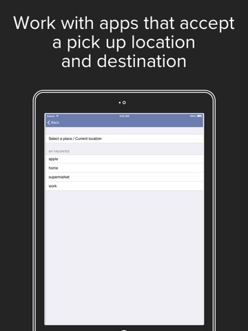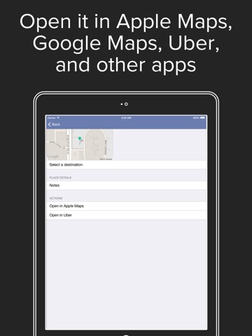 Store favorite places in one app. Launch them in many other apps such as Apple Maps, Google Maps, Uber.