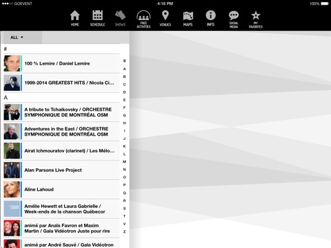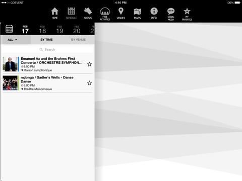 Anytime access to the full programming schedule at Place des Arts, Canada’s largest multi-purpose cultural complex dedicated to the performing arts. Place des Arts is located in the heart of the Quartier des spectacles in Montreal, with six halls featuring over 1,000 performances and events each year. Search for free shows or activities, view the schedule, bookmark and share your favourite shows, and much more!