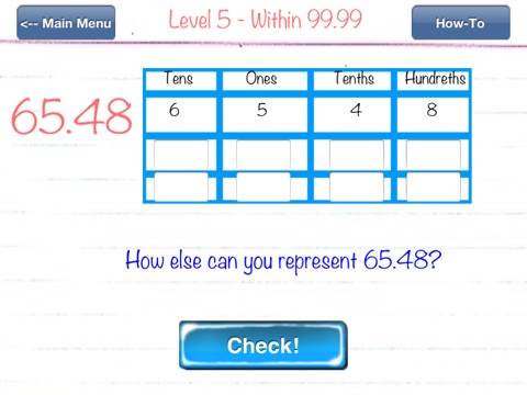 While working through the levels, students will discover the uniformity of the structure of the place value system. They will see that a given place value can always be decomposed to 10 of the place value to its right. This is true across all whole and decimal numbers.