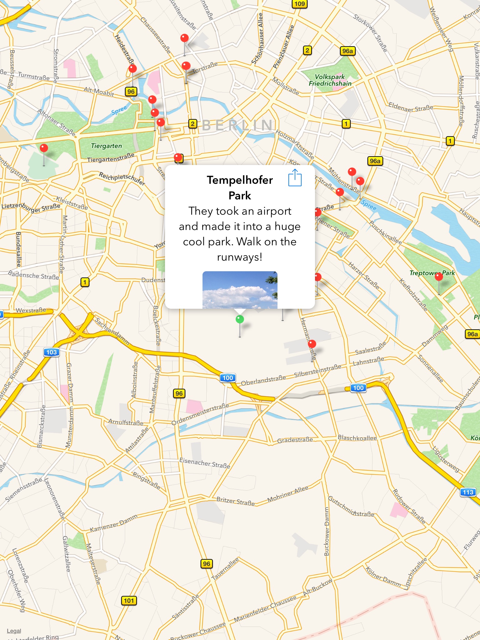 Places helps you build beautiful maps of your favorite cities. Its as simple as adding pins to a map and writing your notes for them. Sharing your maps is as simple as sending your friend a link (your friends dont need to have the app; maps built with Places are beautiful on the web too). Its really useful as a lightweight travel planner/journal, and also great when you have a friend visiting your neighborhood and you want to tell them where to go. Its a small, simple tool and its completely private and free - no ads, obnoxious Facebook logins, or in-app purchases.