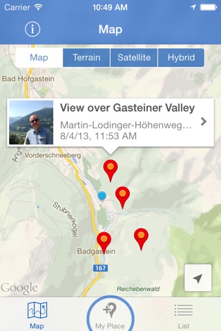 - When tapping a place on the map, you will see the latest photo for that place, together with the title, the nearest address, and the date. You will also see the GPS accuracy for that position as a circle on the map.
