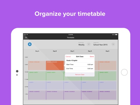 Plan lessons on the go in an easy-to-use editor with curriculum standards and attachments. Planboard organizes your lessons, subjects, and semesters in a beautiful timetable that is with you everywhere.