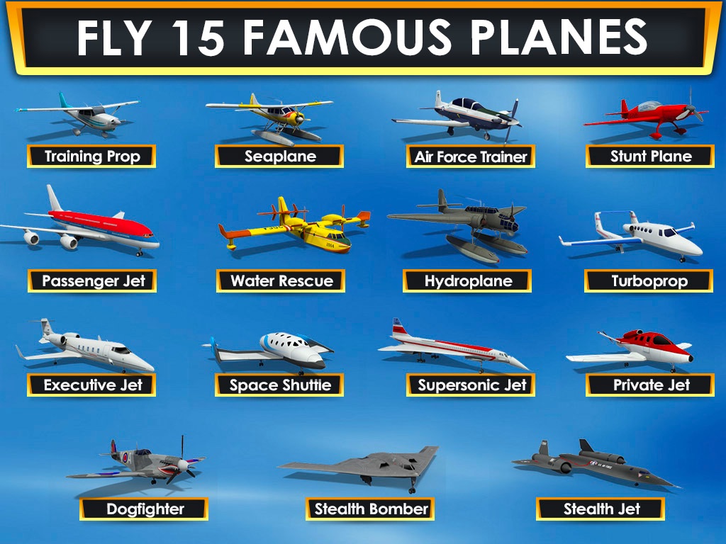 Fly 15 Amazing Aircraft including Civilian Passenger Jets, Military Stealth Planes, Private Jets, Training Props and World War 2 era planes.