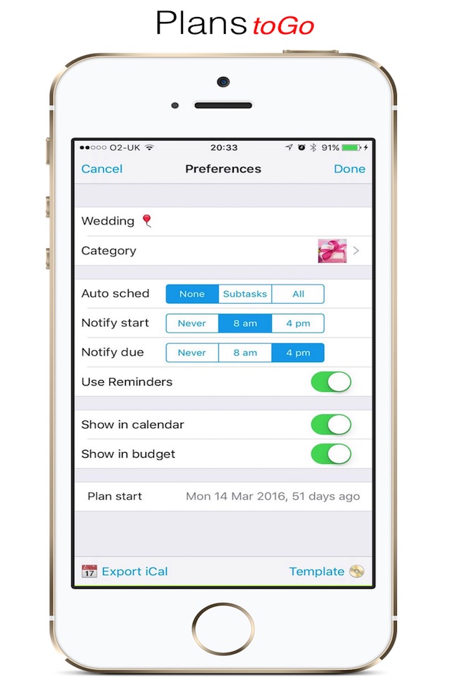 Your plans have three views; tasks, dates and budget items. If you rotate your phone scheduling views appear enabling you to move tasks and amend durations, balance commitments or view overall spending against plan.