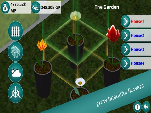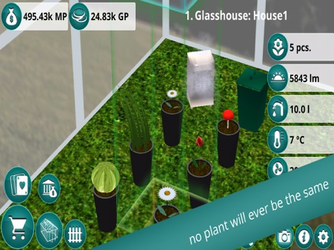 There are many strategic games but Plants & Flowers is not only a conventional plants game but a realistic plant simulation in real time, with a realistic simulated physical environment and a unique mathematical 3D plant system. The plants grow in this garden game like in real life. Growth varies depending on the circumstances of the weather or your growing environment. They can become sick and even infect other plants in the greenhouse, bring greater or lesser income.
