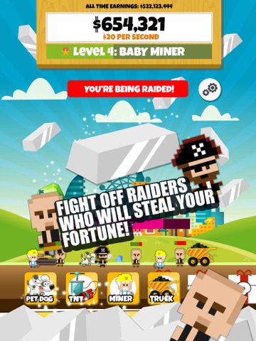 Tap on rocks to mine and buy miners or upgrades to level up and become the most successful mining entrepreneur of all time! Be careful though, raiders will try to steal from your idle empire with random attacks, but with all of your upgrades and bonuses – you’ll defeat them easily.