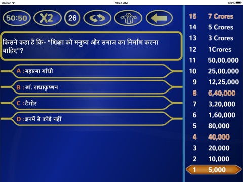 You will have to give correct answer for each multi choice question. If you will give the right answer your next question will be unlocked and you can win certain amount and knowledge for each question.