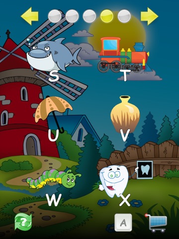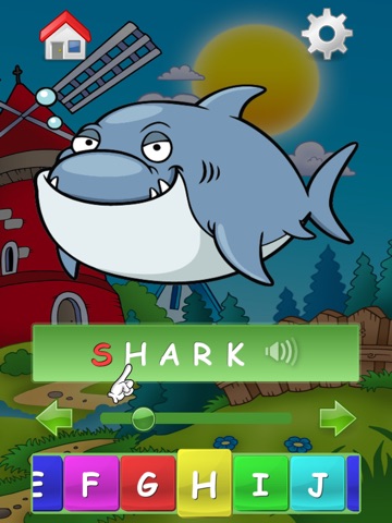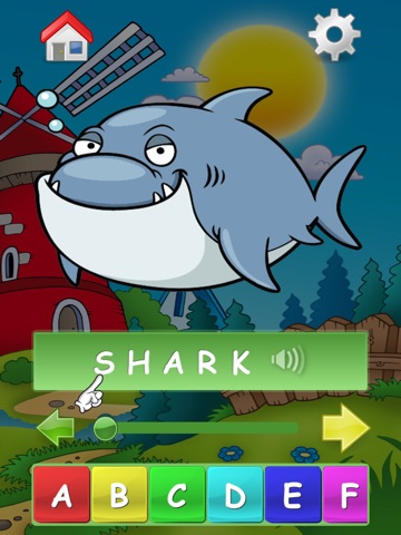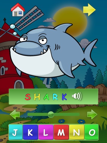 When you choose an image with the desired letter finger on the phrase will point the the letter you need to find on the scrolable alphabet. A yellow arrow on the left or on the right side will show you which way you should scroll to find required letter. When you reach required letter, both arrows become green and required letter start to pulsate on the screen.