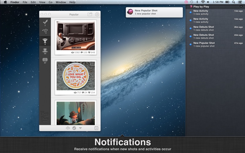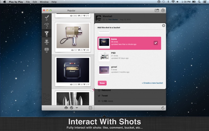 ★★★★★ "Ive only been using Play by Play for a couple days, and Im already loving it. Its like a constant inspiration feed right on my desktop from the best designers in the world. It makes Dribbble really accessible and fun."