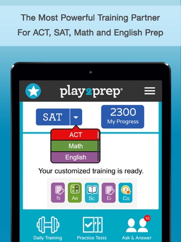 play2prep provides the most powerful personalized training for you to achieve your highest score on ACT, SAT, Math and English tests. Recognized for excellence by Time Magazine, Edutopia and EdTech Magazine, play2prep has guided hundreds of thousands of students to achieve their best score. Sharpen your skills with customized daily training, get test tough with simulated tests, improve your time management with games – on your own or against other players, and track your progress to achieve your goal.
