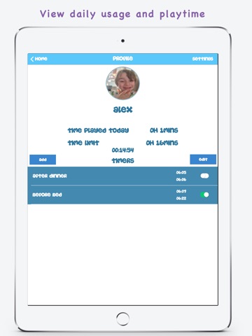 I have four kids, & prefer to manage the timers on my phone. Problems are: 1. When one alarm goes off, it doesnt tell me which one, so after I turn off the alarm, I have to go into each profile to find which childs time expired. 2. When asked for the password, the password is displayed, instead of ****. 3. It would be really nice if I could recycle a timer instead of having to delete it, enter the passcode, & create a new timer. Or at least give the option of automatically deleting the used alarms, since the password already has to be entered to turn off the alarm. Or maybe the option of deleting multiple alarms at once instead of having to enter the password with each alarm deletion. 4. Finally, today I got the message, "Time already exists for selected date or you tried to add timer in the past." I often have a couple timers running simultaneously, so I dont know why this came up today? But since it wont let me add an alarm, the app is fairly useless to me. Perhaps it is very useful to parents if it is installed on the childrens devices, but for children on the autism spectrum, to have their play suddenly cut off without any warning, is very upsetting. I prefer to hold the time reigns and give them a 1 or 2 minute warning to wrap up.