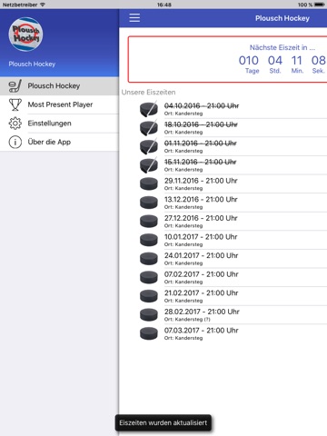 • Eine aktive Internetverbindung wird benötigt, wenn du die Eiszeiten oder die Most Present Player Daten aktualisieren möchtest, die Hockey News abrufen möchtest, ein Feedback Mail zur App senden oder meine Website aufrufen möchtest.