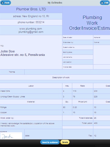 This app is designed specifically for plumbing contractors. It offers the possibility to create, save, and send via email plumbing estimates/work orders/invoices.