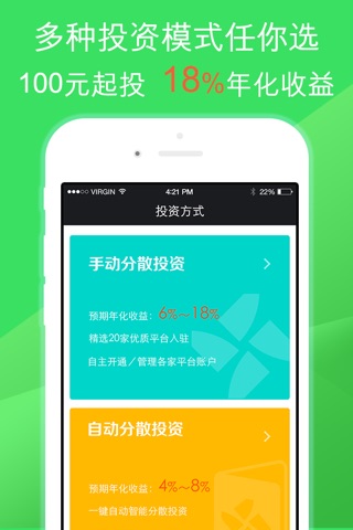 特色产品: 手动分散投资 6-18%年化收益, 自动分散投资 4-8%年化收益。 更有新手5%额外加息活动进行中!!!
