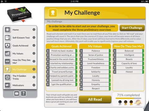 On doit dabord faire notamment un test et donner la liste de 10 valeurs quon croit avoir (... loyauté,... empathie.....)!! Genre on coeur travailler sur son estime de soi alors quon sait déjà quon a plein de qualités