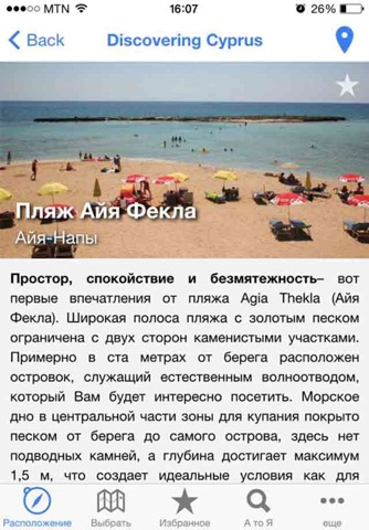 Проект Discovering Cyprus («Откройте для себя Кипр») представляет 44 пляжа и интересных участка побережья свободной части района Фамагуста – от живописной церкви Айя Текла в окрестностях Айя-Напы до пляжа “Scouts Beach” в Протарасе. Здесь вы найдете: