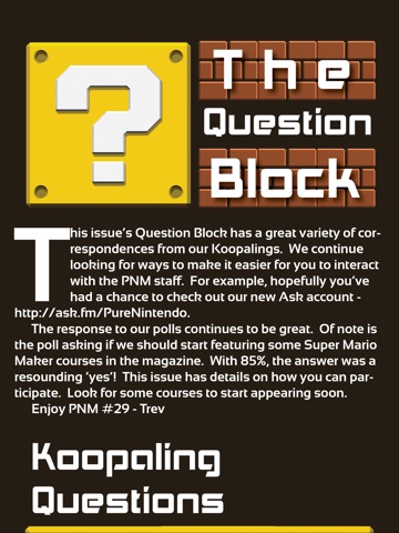 Pure Nintendo has some great Nintendo news and behind-the-scenes interviews with developers and studios. Articles you wont find everywhere, which in the dying print world is a must. The app itself is bright, clear, and aesthetically pleasing to look at. Pages flow smoothly and there are interactive sections that make it delightful to read. As opposed to a plain PDF of the issue. I would recommend this app to anyone that misses Nintendo Power, especially since the new issues are being made available quicker in app.