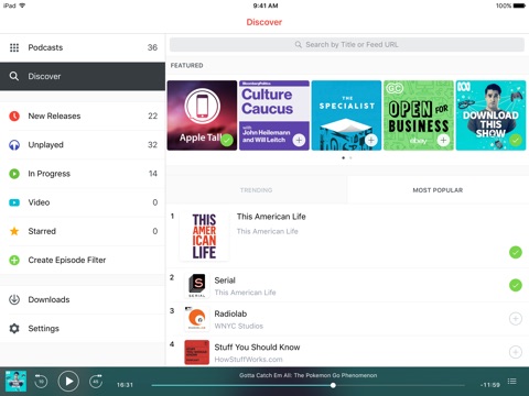 Si vous cherchez du simple, rapide, bien pensé vous êtes au bon endroit. Je désinstalle podcaster illico. Tout ce dont on a besoin pour lire des podcasts est là. Pas besoin dimporter des liens ou fichiers xml (vous arrivez à récupérer facilement les adresses xml ou RSS de tous vos podcast vous?) le moteur de recherche a trouvé tout ce que je lui ai soumis, quelque soit la langue. A ne pas manquer et dites au revoir a itunes.
