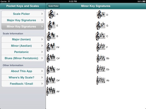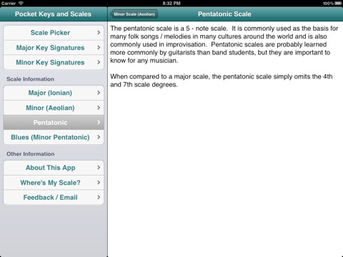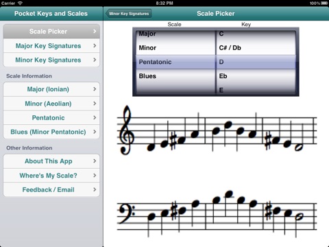 Pocket Keys and Scales puts any major or minor key signature at your fingertips in just one tap of the screen. Tap again on any key signature and you will see the written music for the scale in treble and bass clef. Also included is a thirds exercise and an arpeggio exercise in every major and minor key. Pocket Keys and Scales also includes the written music for pentatonic and blues (minor pentatonic) scales in every key.