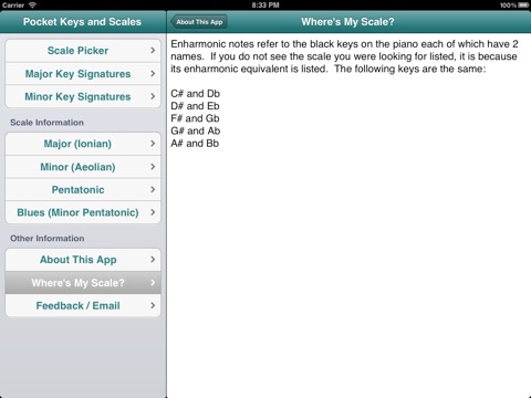 Pocket Keys and Scales is great for developing musicians that need a quick reference for major, minor, pentatonic, or blues scales in every key. It can be used to simply identify key signatures or as a way to display the written music for scales.