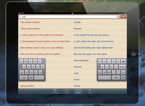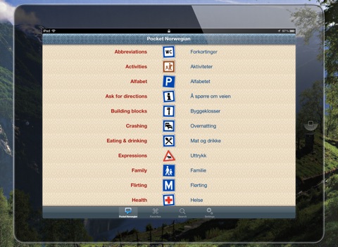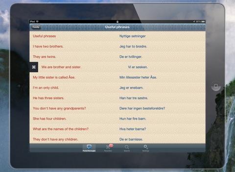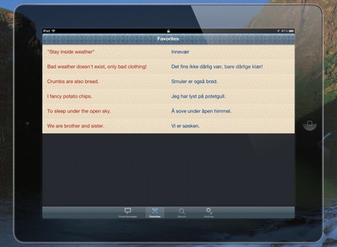 Pocket Norsk distinguishes itself by a relaxed look and feel, modern and useful vocabulary and a very handy swipe-to-mark-as-favorite feature for quick retrieval for when it comes down to it.