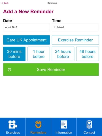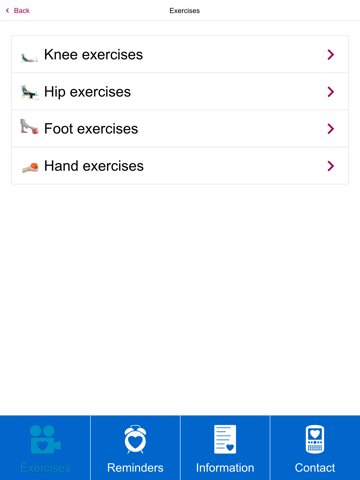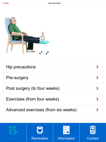 The app provides videos and text instructions on pre- and post-operative physio exercises, enabling you to establish a strong exercise regime before surgery that you can also continue afterwards, helping you to make a speedy recovery. You can even plan your own physio exercise regime using the reminder function.