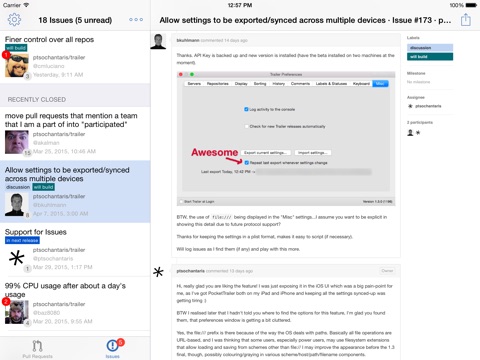 This is the iOS version of Trailer for the Mac, an app for tracking and getting notified about GitHub and GitHub Enterprise pull requests, issues, comments, assignments, and merges, across repositories and servers.