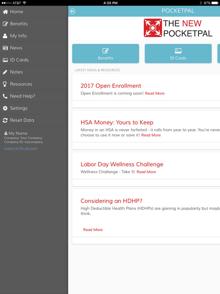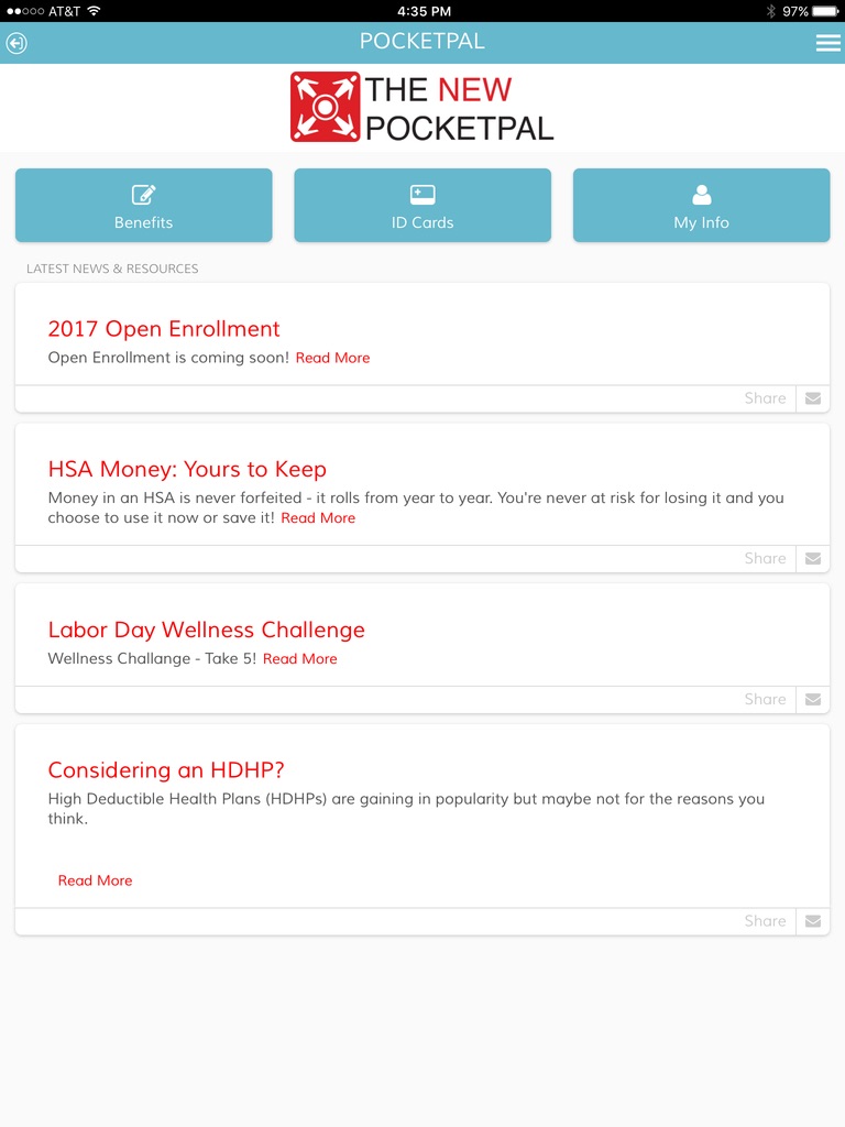 Employers can add custom buttons for things like telemedicine, prescription drug discount sites, and other information they want to share with employees and their dependents. The Pocketpal also has a built-in-message center allowing employers to communicate with employees using push notifications.